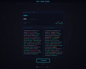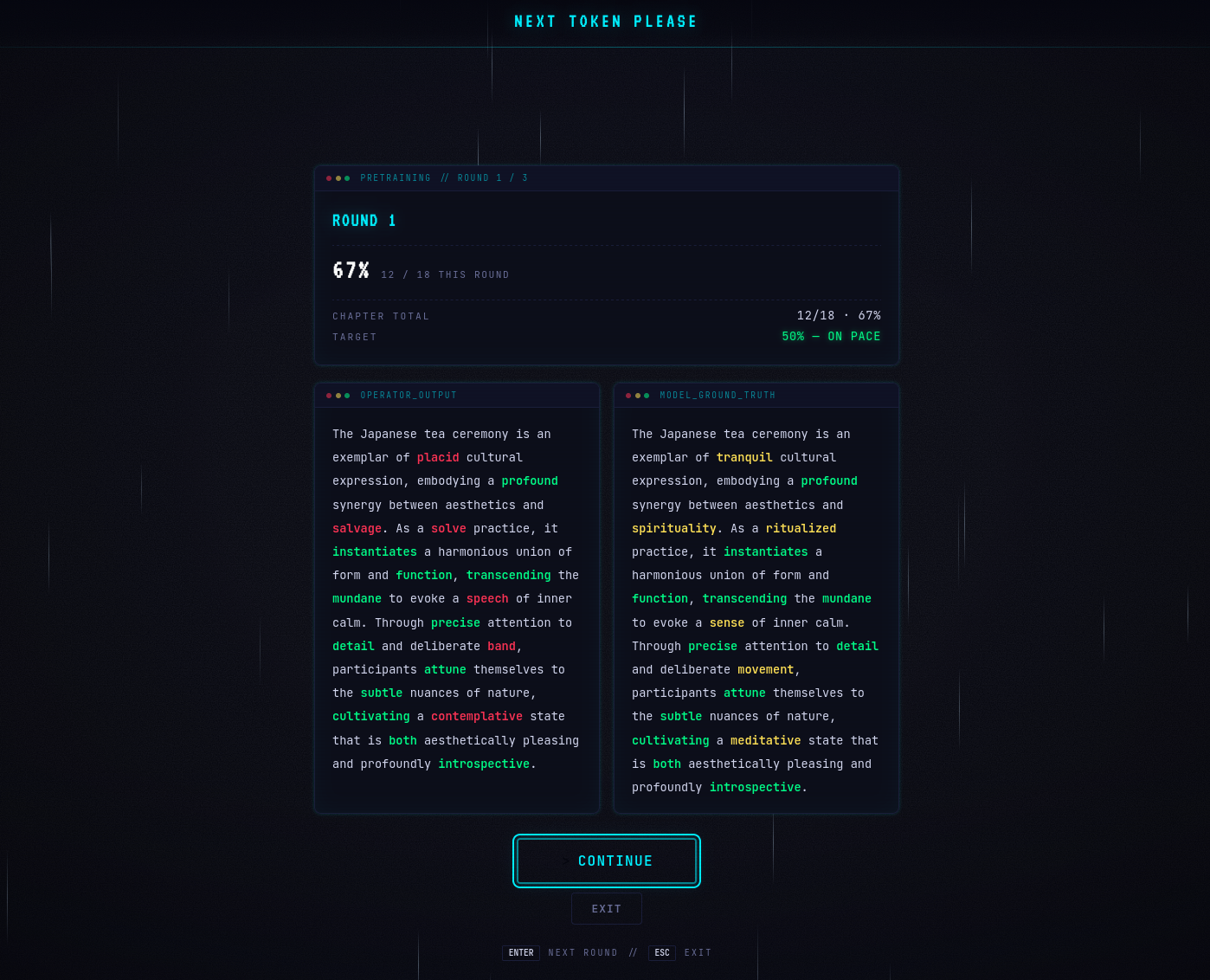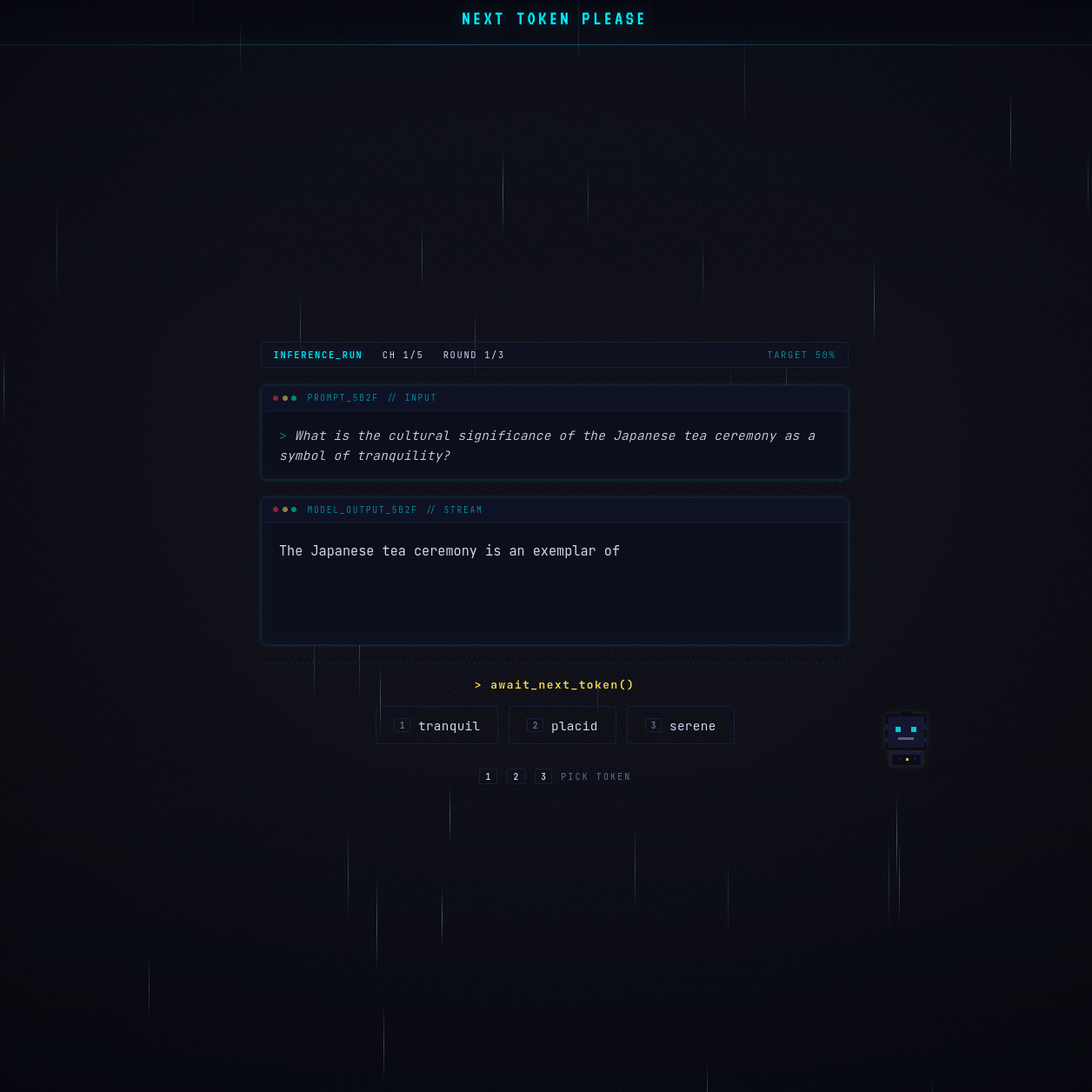 One prompt. One answer. The model writes in real time, token by token — until the signal breaks and control is handed to you. Three candidates appear. Choose the correct token and clear the threshold to survive.